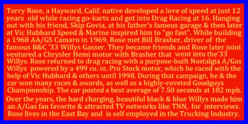 This Video Scrapbook on Terry also contains many other popular Gassers running on the West Coast. The cars were recorded with unrestricted audio. The full sound of the Terry Rose Pro Stock type launches is music to the ears. Long Live The Gassers...!
